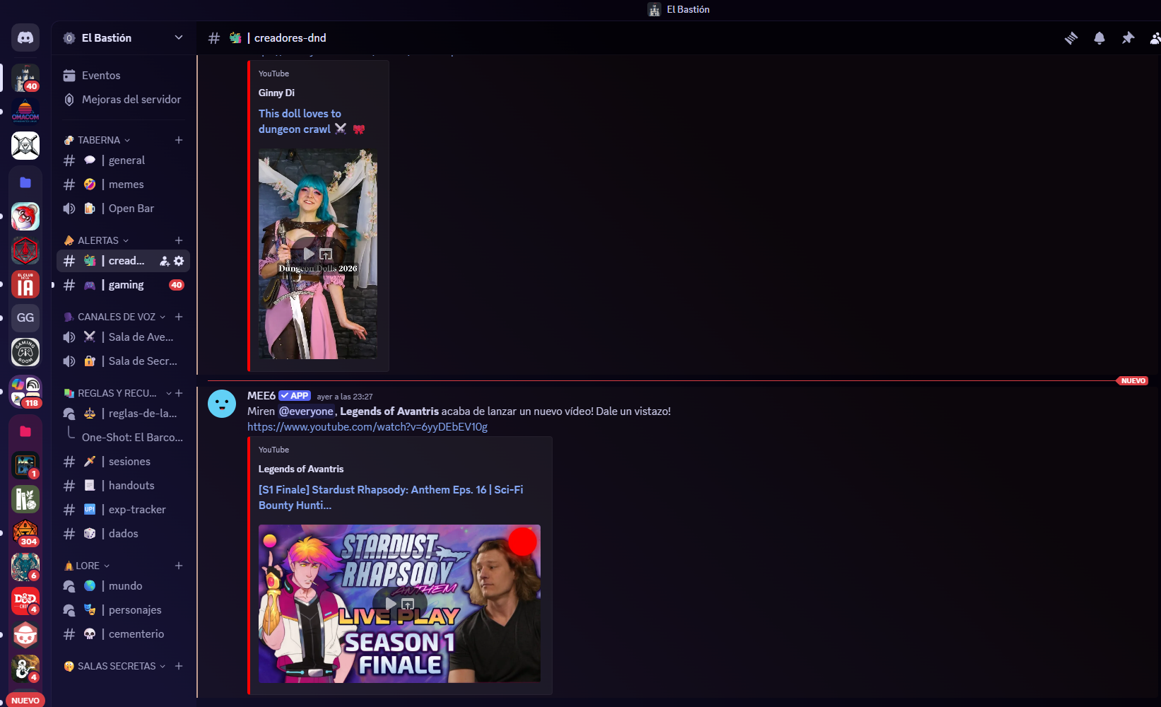 Hace poco decidí armar un servidor dedicado de Discord para mis partidas de Dungeons&Dragons de forma de tener más ordenada toda la información ya que en la última campaña pasaron cositas. Así que para inspirarme me puse a ver algunos vídeos tutoriales y este en particular lo encontré muy completo.