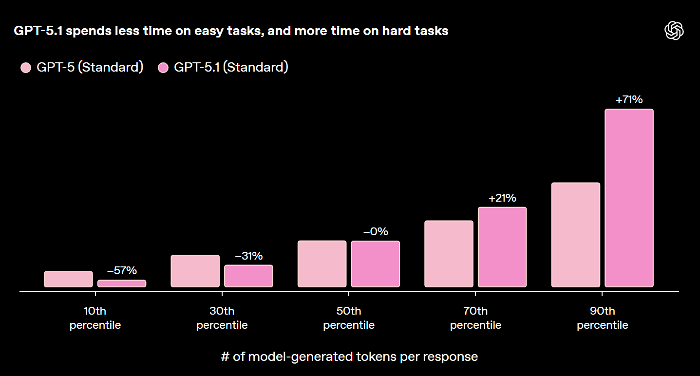 Por su parte, GPT-5.1 Thinking se vuelve el modelo de pensamiento más capaz dentro de la familia GPT, y es capaz de responder con mayor velocidad en tareas rápidas, y darse mucho más tiempo en tareas complejas, facilitando el uso diario del modelo (a veces en GPT-5 Thinking pasaba que le pedías algo simple y se demoraba mucho en contestar, porque estaba programado para pensar mucho, ahora se adapta)