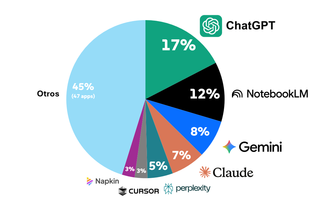 Por un lado, ChatGPT sigue siendo el rey, pero su reinado ya no es absoluto. El mercado se diversificó con 55 herramientas distintas mencionadas (vs 36 el año pasado).