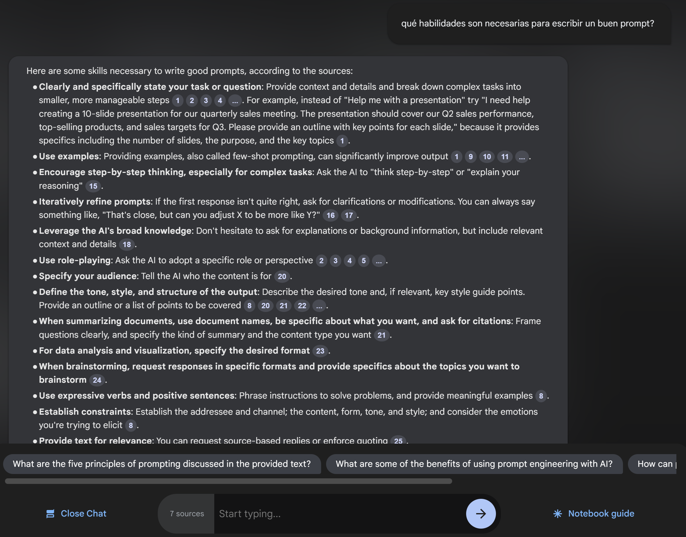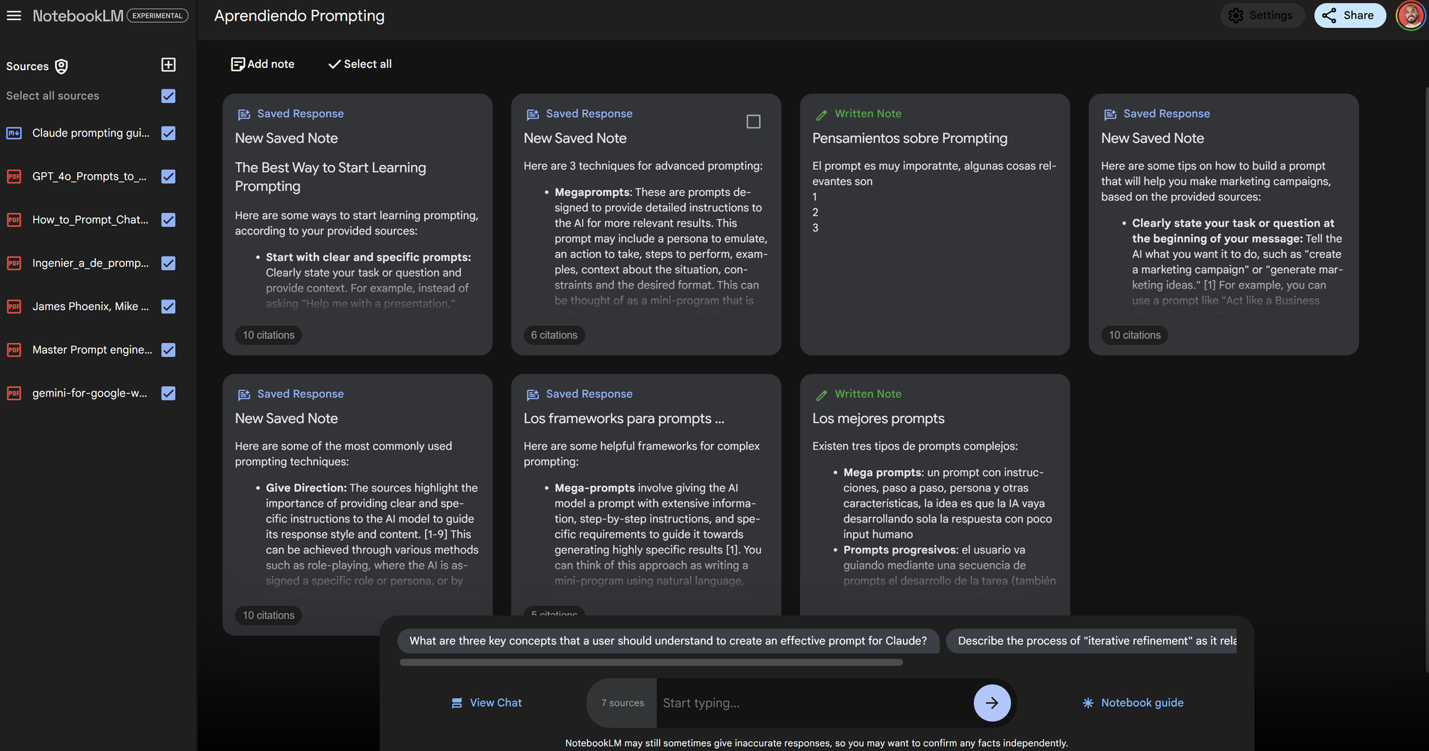 Con ello podrás hacerle preguntas a tu cuaderno y creará respuestas usando de base lo que le hayas cargado. Citando y haciendo referencias. O hasta podrás pedirle que cree F.A.Q.s, preguntas para estudiar la materia y mucho más.