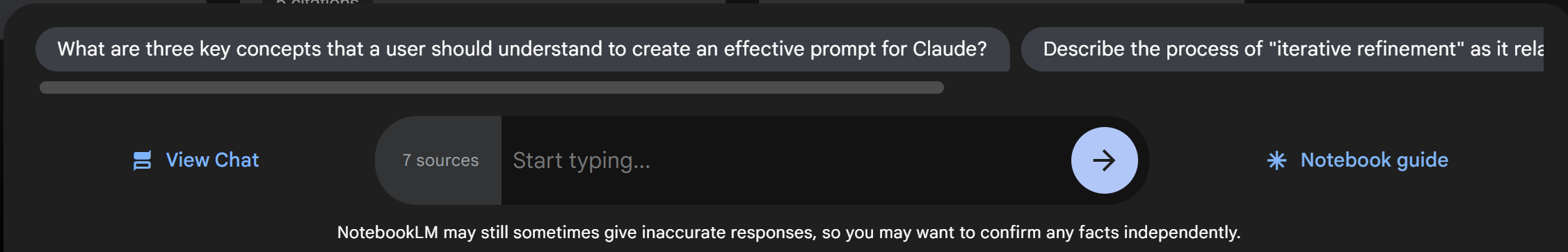 - Botones para prompts rápidos como FAQ, Study Guide, Table of Contents, Timeline, y Briefing Doc.