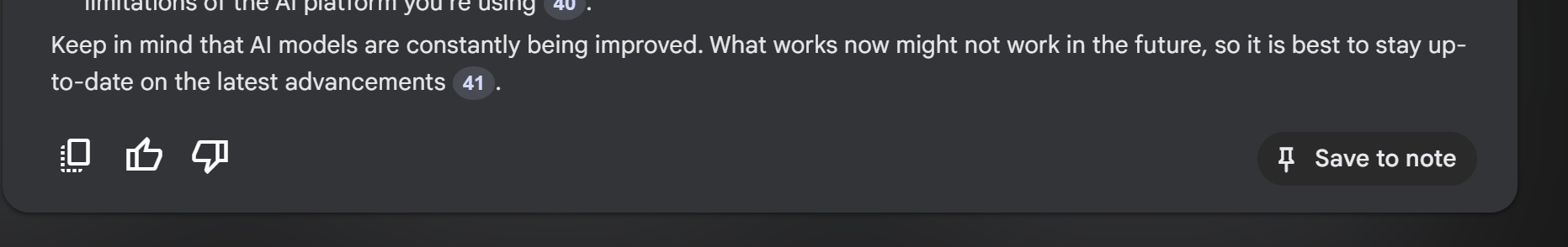 - La conversación que tengas con el modelo desaparece una vez que cierras la ventana, por lo que si hay una respuesta que te gustó usa la función de guardar mensajes como notas.