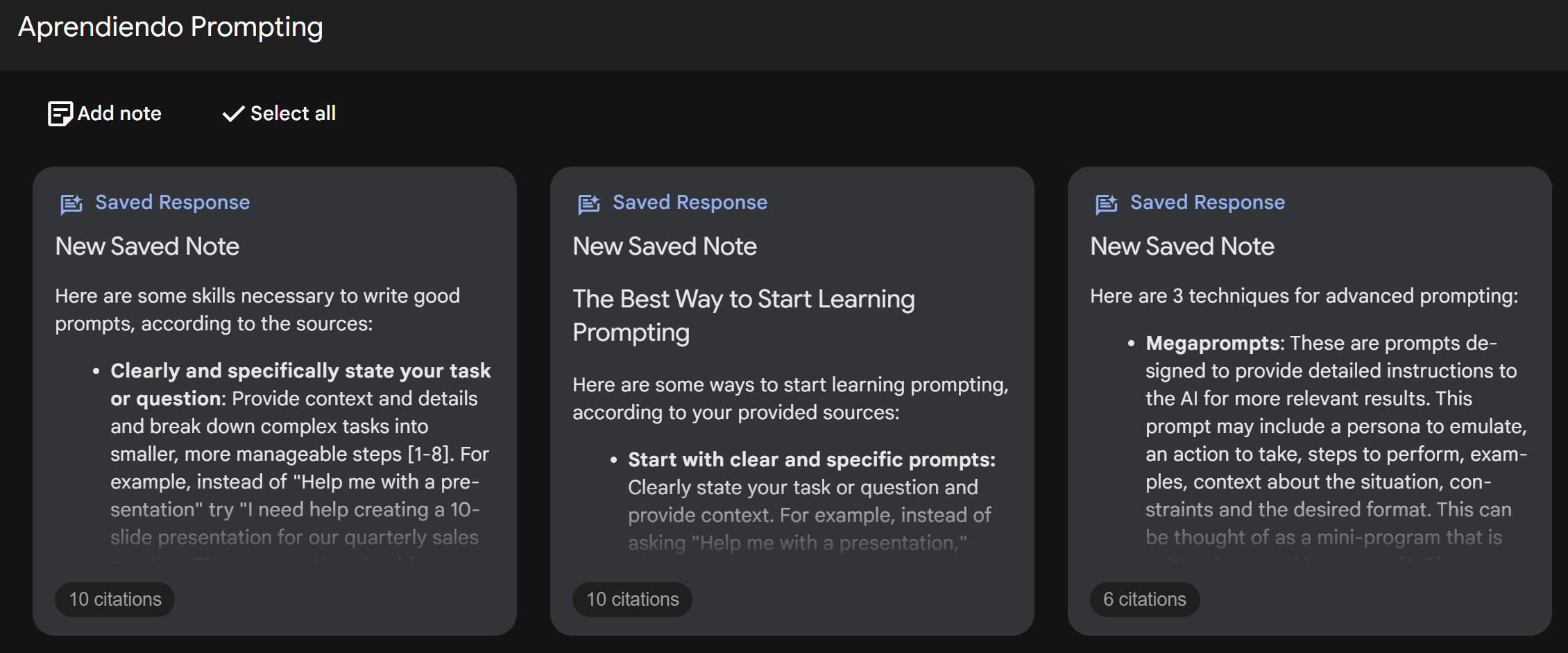 Para ello cuando veas una respuesta que quieras mantener, en la parte inferior de la nota verás el botón "Save to note", al hacerle clic la nota pasará a ser parte del tablero principal de NotebookLM.