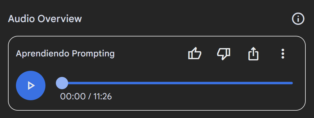 Una vez que el contenido de audio esté listo, verás lo siguiente, donde podrás escuchar el podcast, compartirlo, descargarlo o borrarlo: