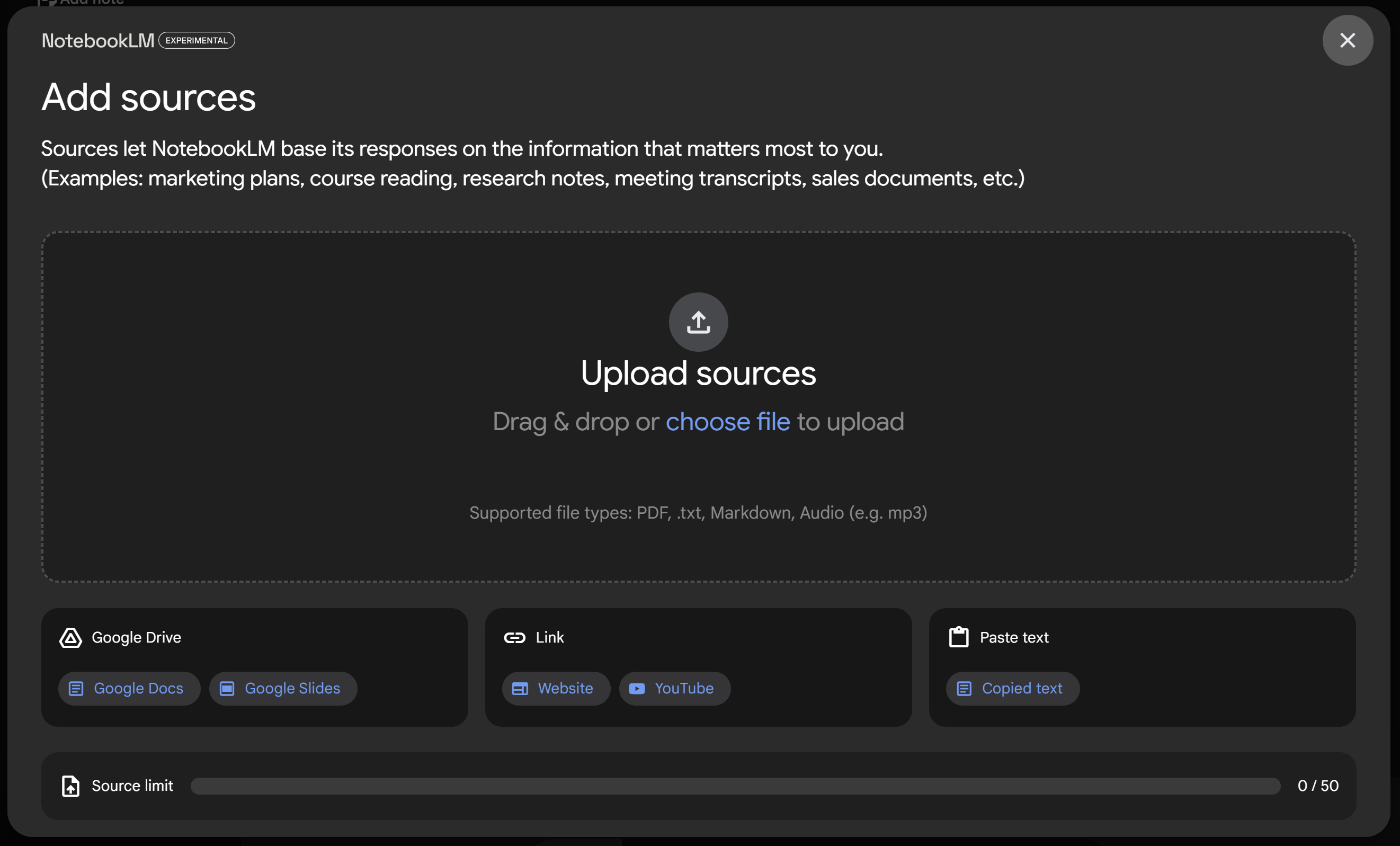 - Cargar tus fuentes o documentos de referencia, si el cuaderno es nuevo te abrirá el siguiente modal donde podrás cargar documentos. Permite hasta 50 documentos distintos, que pueden ser: PDF, txt, markdown, audio, Google Docs y Google Slides, Link a una web o a un vídeo de YouTube, o pegar texto plano.