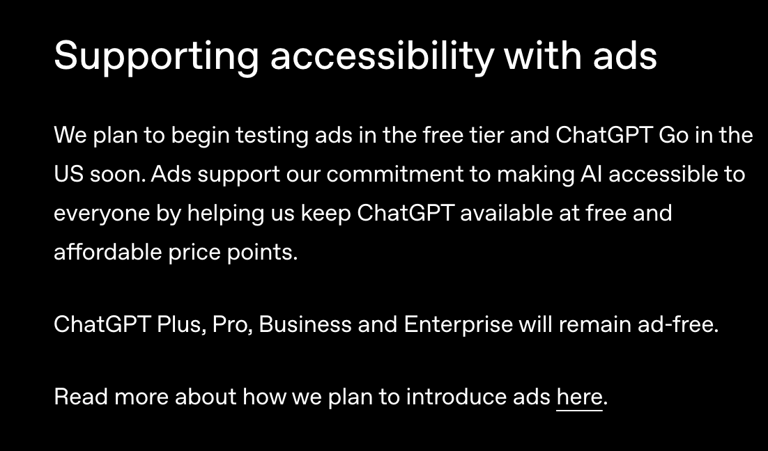 Puedes leer más sobre su plan de cómo piensan implementar los avisos publicitarios en ChatGPT acá, pero en corto: